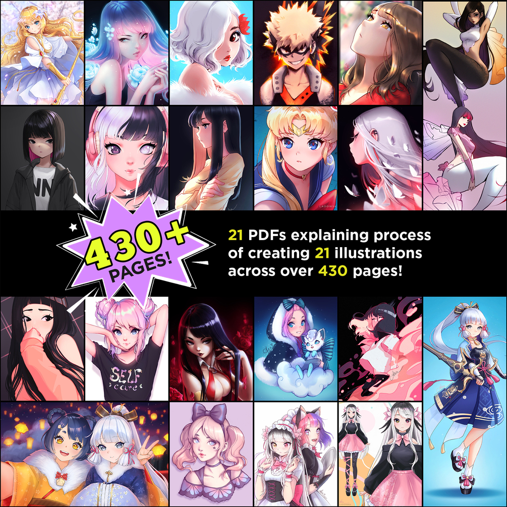 This bundle contains 21 PDFs that explain my thought process of creating 21 different Digital illustrations. With over 430 combined pages of pictures and explanations, I'm sure you can learn and see how I create my art. All software information and brush settings are included.